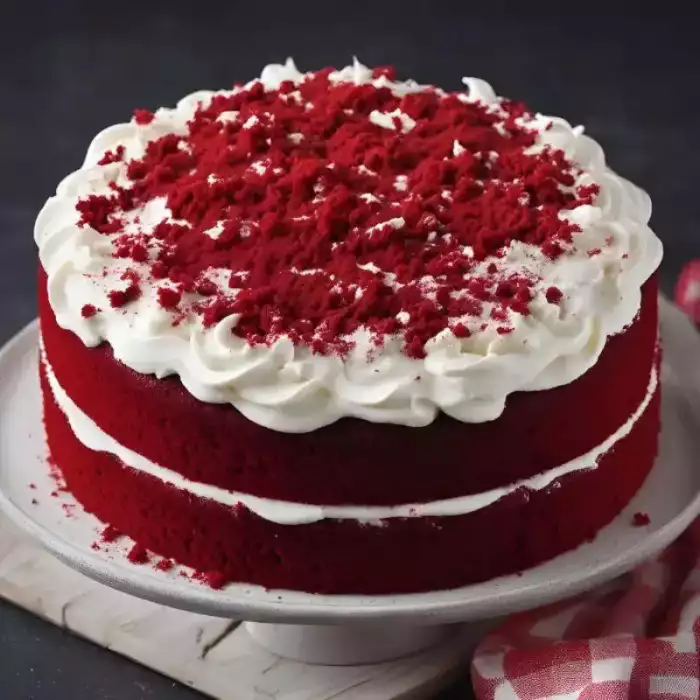 A two-layer naked cake design, featuring a smooth frosting center and a generous topping of vibrant red cake crumbles framed by white buttercream swirls.