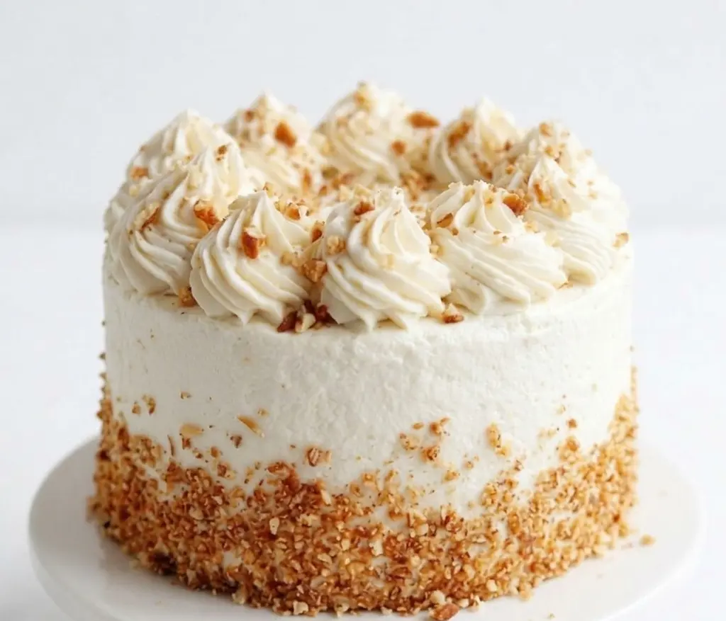 The sides are coated in a buttery golden crumble, with piped rosettes on top and a smooth frosting center.