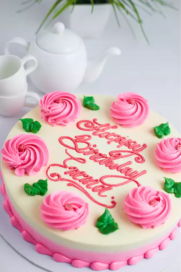 Rose Delight is a birthday cake that exudes simplicity and is designed for those who appreciate the beauty in understated sophistication. The birthday cake's design focuses on clean lines and a refined aesthetic. Its smooth surface serves as a canvas for the subtle yet impactful decoration that defines its character. The highlight of this cake is the strategically placed rosette piping, which is artfully arranged to mimic a gentle blush on the cheek. This unique design element adds a soft, romantic touch to the cake, making it visually intriguing and delightfully charming. Decorated with lush rose patterns, this cake is a timeless way to say “I love you” or celebrate a special mum.